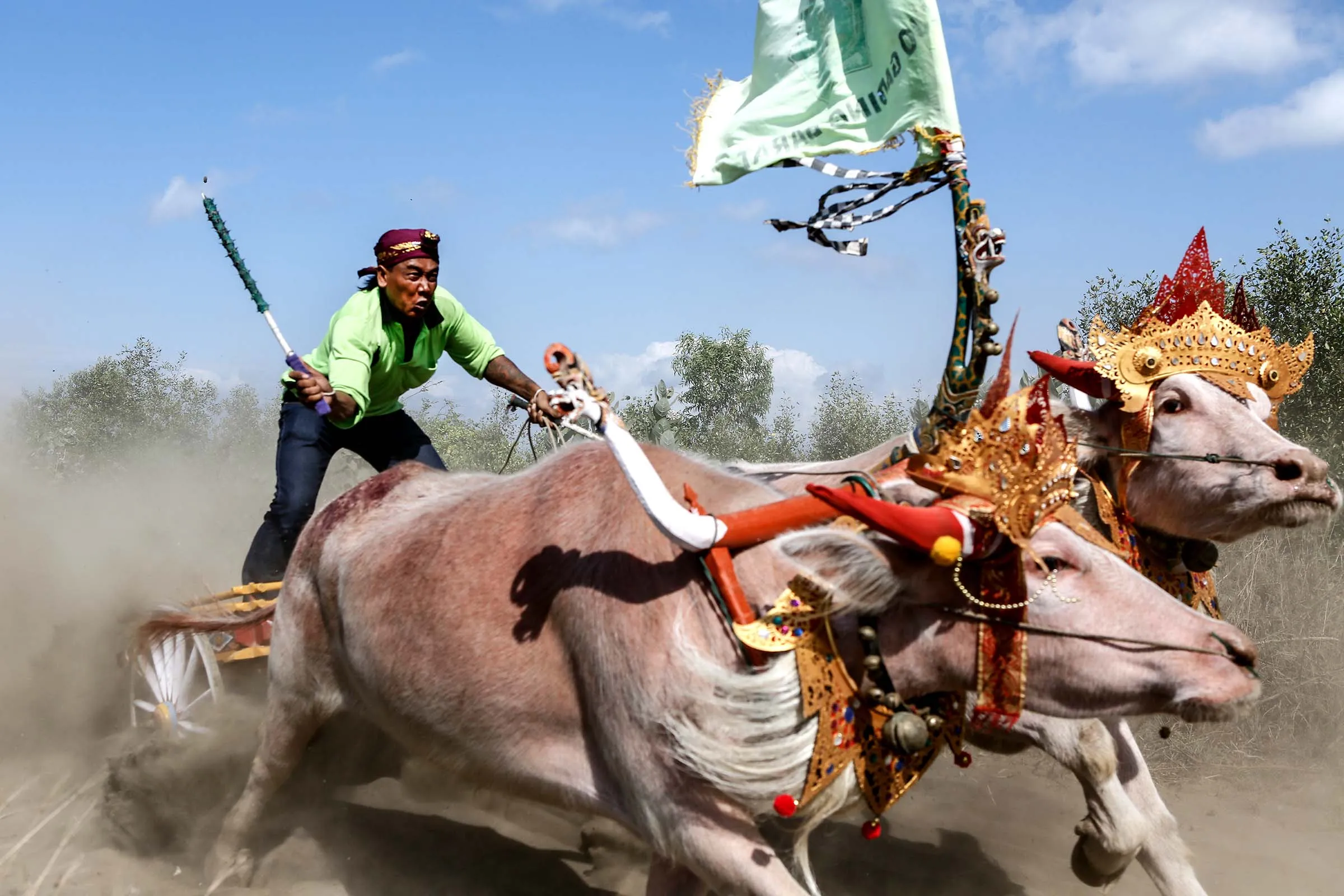 A contestant competes during the traditional “Mekepung” water buffalo race near Negara, Bali, Indonesia, on August 3, 2014. Water buffaloes are raced in what was originally designed as a fun game for peasants to spend their free time between the end of harvest and the start of the planting season. (Photo by Putu Sayoga/Getty Images)