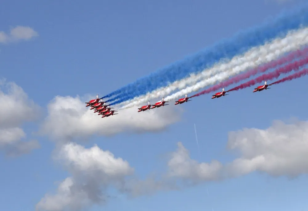 The Red Arrows display team perform a fly past to officially open the 2014 Farnborough International Airshow in Farnborough, southern England July 14, 2014. (Photo by Kieran Doherty/Reuters)