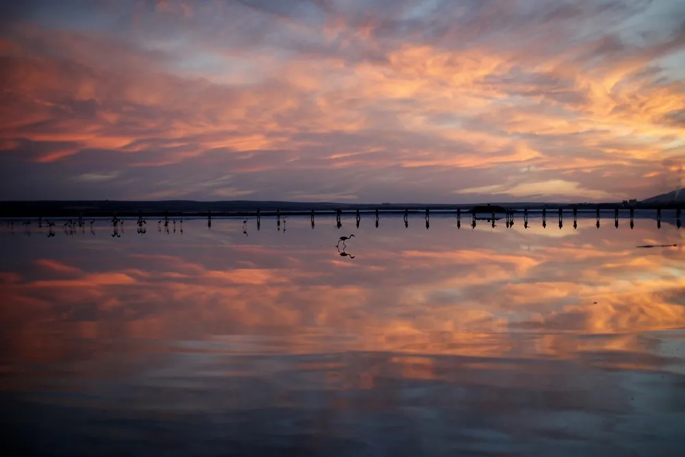 Volunteers wade across the lagoon at dawn to gather flamingo chicks and place them inside a corral at the Fuente de Piedra natural reserve, near Malaga, southern Spain, July 19, 2014. Around 600 flamingos were tagged and measured before being placed in the lagoon, one of the largest colonies of flamingos in Europe, according to authorities of the natural reserve. (Photo by Jon Nazca/Reuters)