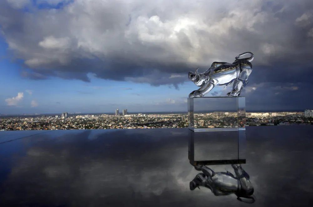 A crystal bull seen on a roof top as moonsoon rainclouds loom in the background in Calcutta, Eastern India on July 26, 2014. The summer monsoon season in India usually begins in the months of June and July and lasts until October. (Photo by Piyal Adhikary/EPA)