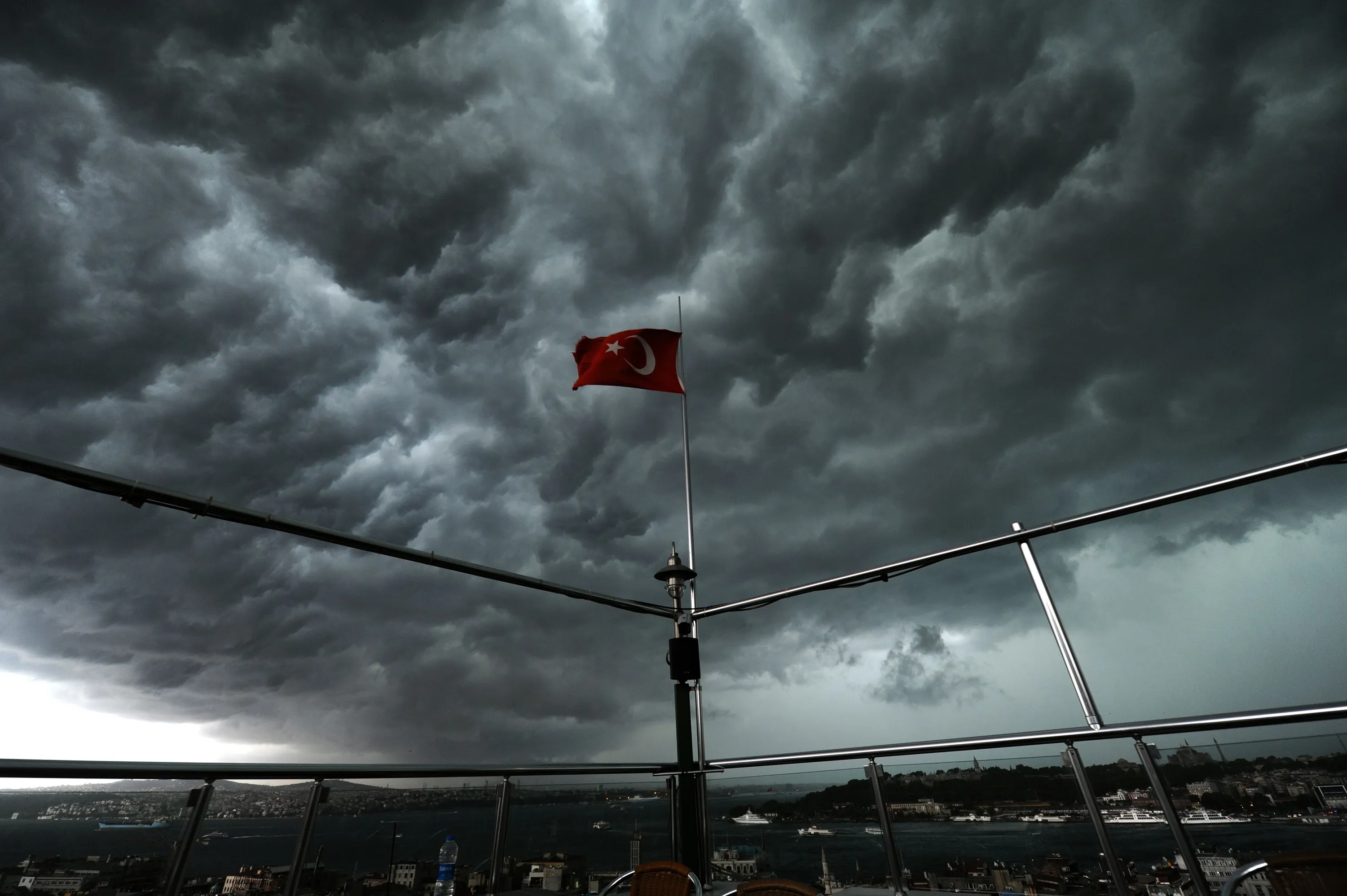 Clouds gather over the Bosphorus behind a Turkish flag during a storm on August 7, 2014, in Istanbul. (Photo by Ozan Kose/AFP Photo)